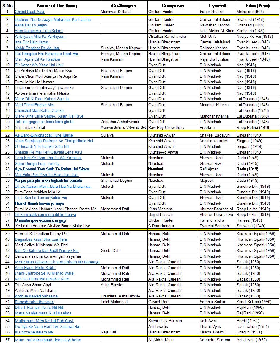 I have not made a table of her songs under different lyricists, but from the detailed table below it is quite evident that DN Madhok wrote the maximum of 27 out of her 57 songs.