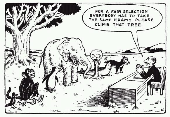 Failing an elephant because it cannot climb a tree, failing a monkey because it cannot fly, condemning a goat because it cannot uproot a tree, that is how our Macaulean education system judges its students.